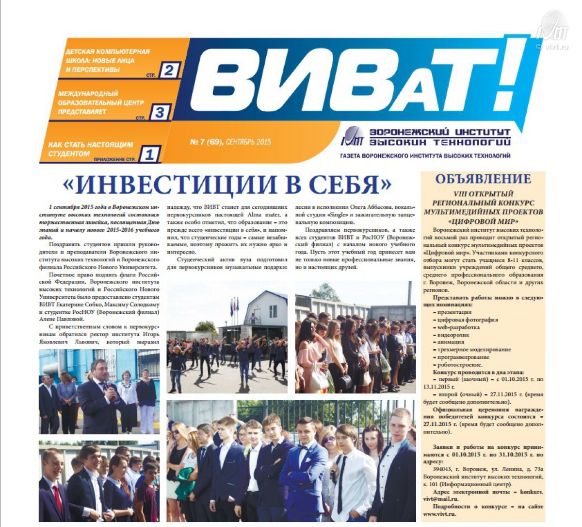 Вышел первый в этом учебном году номер газеты «ВИВаТ!». В этом выпуске мы рассказываем не только о жизни вуза в первый осенний месяц, но и о значимых событиях, которые произошли в институте за период летних каникул.