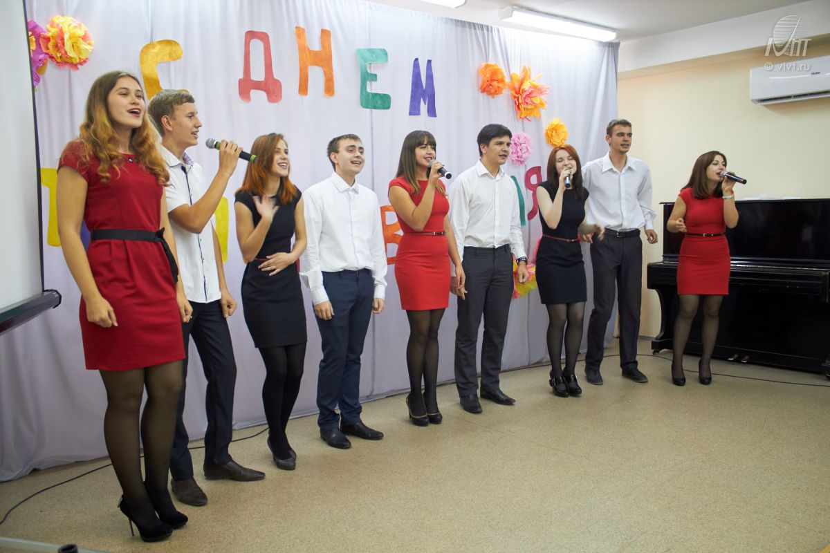 5 октября в Воронежском институте высоких технологий состоялся праздничный концерт, посвященный Дню Учителя. В концертной программе участвовали признанные в институте артисты: Олег Аббасов с песней «Разговор со счастьем», вокальная студия «Single» с музыкальной композицией «Не буду верить ветрам», педагогический отряд с зажигательным танцем «Будет светло».